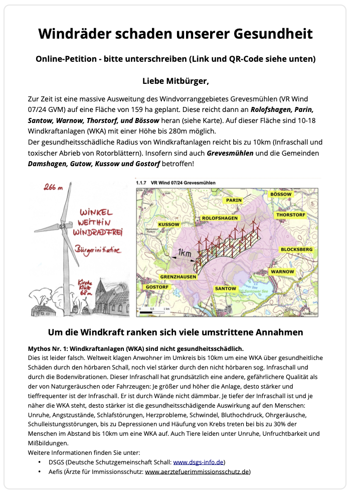 In der Nähe von Parin wird derzeit ein Planungsgebiet für Windkraftanlagen (WKA) ausgewiesen (VR GVM 07/24). Dort könnten mindestens ein Dutzend weitere WKA gebaut werden, neben den schon bestehenden Anlagen in etwas weiterer Entfernung zu Parin (Rolofshagen, Santow).