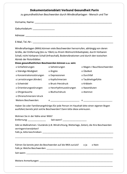 Dies ist leider falsch. Weltweit klagen Anwohner im Umkreis bis 10km um eine WKA über gesundheitliche Schäden durch den hörbaren Schall, noch viel stärker durch den nicht hörbaren sog. Infraschall und durch die Bodenvibrationen. Dieser Infraschall hat grundsätzlich eine andere, gefährlichere Qualität als der von Naturgeräuschen oder Fahrzeugen: Je größer und höher die Anlage, desto stärker und tieffrequenter ist der Infraschall. Er ist durch Wände nicht dämmbar. Je tiefer der Infraschall ist und je näher die WKA steht, desto stärker ist die gesundheitsschädigende Auswirkung auf den Menschen: Unruhe, Angstzustände, Schlafstörungen, Herzprobleme, Schwindel, Bluthochdruck, Ohrgeräusche, Schulleistungsstörungen, bis zu Depressionen und Häufung von Krebs treten bei bis zu 30% der Menschen im Abstand bis 10km um eine WKA auf. Auch Tiere leiden unter Unruhe, Unfruchtbarkeit und Mißbildungen.Weitere Informationen finden Sie unter: