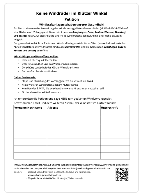 Unser Anliegen: Wir vom Verbund Gesundheit Parin möchten die Weite und einmalig schöne Landschaft rund um unser Dorf erhalten, sowohl für die große Zahl unserer erholungssuchenden Gesundheitsgäste, als auch für uns im Dorf und den umliegenden Dörfern. Unser dringendes Anliegen ist, daß dieses Vorranggebiet für Windenergie aus der Planung des AfRL (Amt für Raumordnung und Landespflege Westmecklenburg) herausgenommen wird und KEINE weiteren Windenergieanlagen im Klützer Winkel oder einem Abstand von bis zu 5 km zum Dorf Parin gebaut werden.